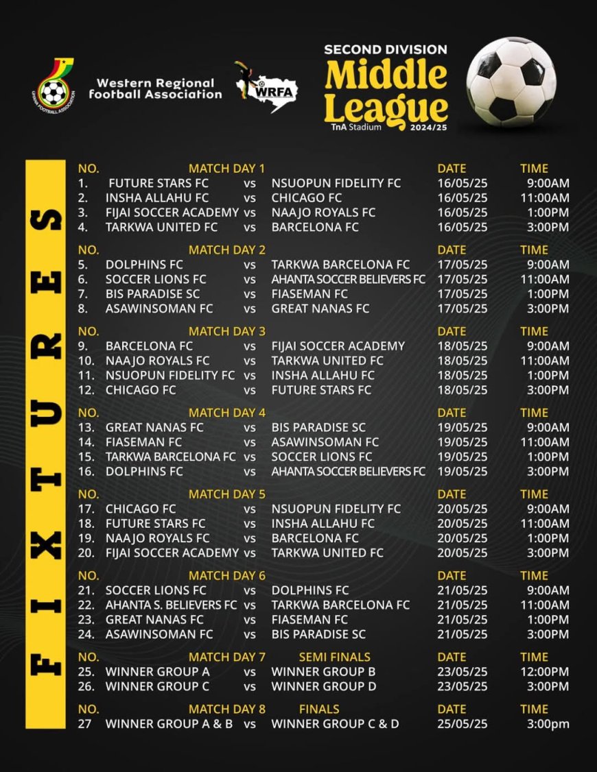 The Western Regional Football Association (WRFA) has officially released the fixtures for the much-anticipated 2024/25 Second Division Middle League, set to take place at the TNA Stadium.